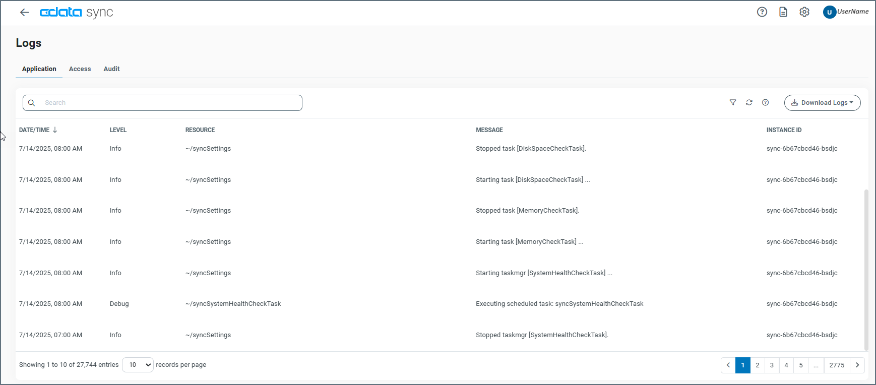 CData Sync は、ログアクティビティページで、アプリケーションリクエスト、アクセスリクエスト、および設定変更の監査といった以下の種類のアクティビティログを保持します。以下に示すように、右上のメニューバーにあるログブックアイコンをクリックすると、ログページにアクセスできます:
