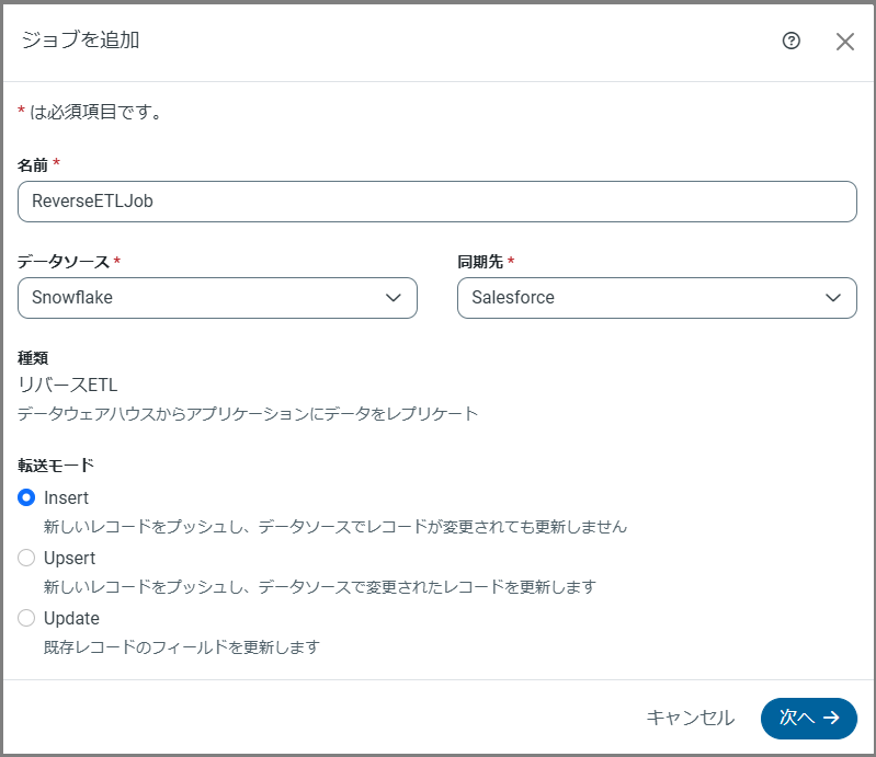 データソースおよび同期先を入力すると、ジョブを追加ダイアログボックスが展開し、上で示すように種類セクションと転送モードセクションが表示されます。種類セクションは、ジョブがリバースETL であることを示し、転送モードセクションでは、実行するデータ転送の種類を選択できます。転送モードについて詳しくは、リバースETL 処理についてを参照してください。
