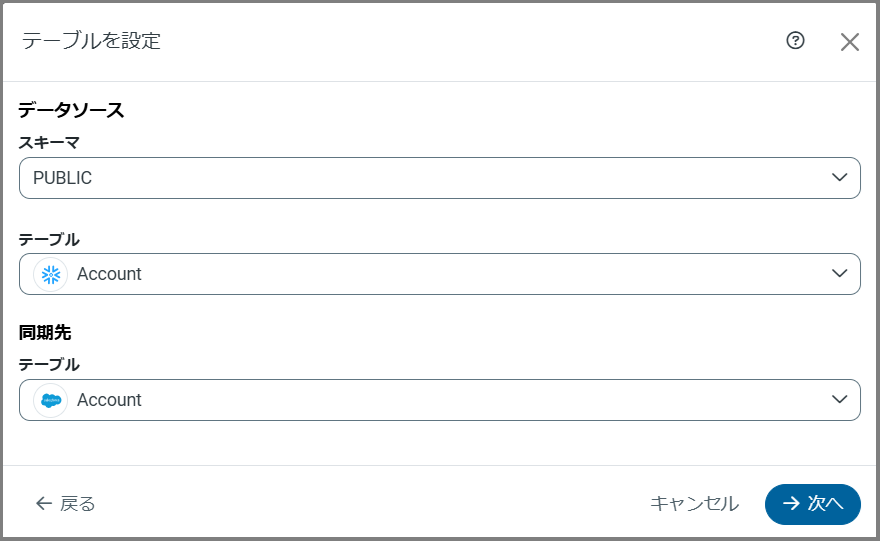 テーブルを設定ダイアログボックスで、スキーマ、データソーステーブル、および同期先テーブルを選択します。