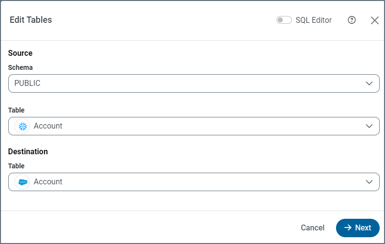 Update - データソースの既存のレコードを更新する場合は、このモードを選択します。Update モードは、Salesforce ID またはMicrosoft Dynamics 365 代替キーを使用してソーステーブルと同期先テーブルのレコードを一致させます。Salesforce ID またはDynamics 365 代替キーにマッピングするソースカラムを選択する必要があります。
