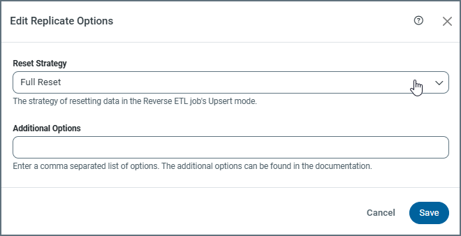 また、Reset Strategy ドロップダウンリストの下にある追加オプションテキストボックスに、レプリケーションオプションのカンマ区切りのリストを入力することもできます。
