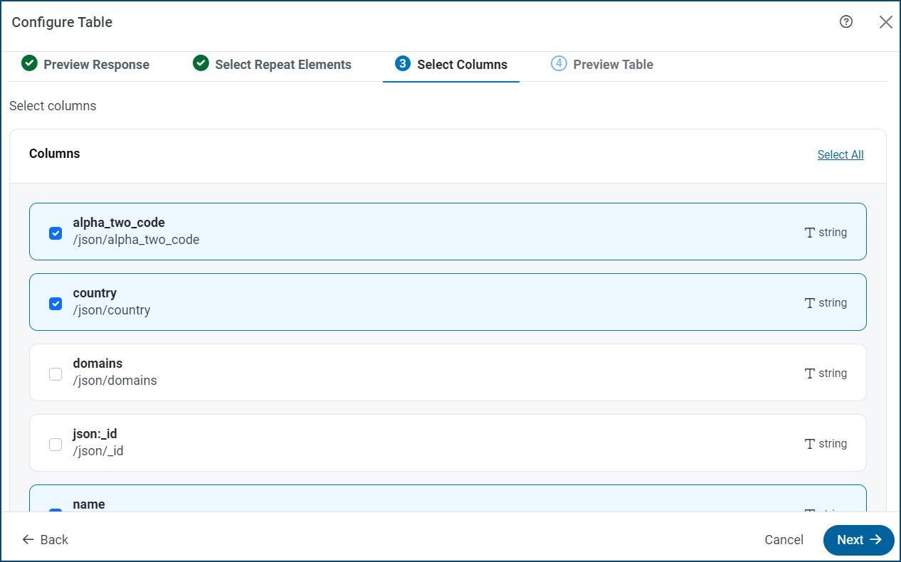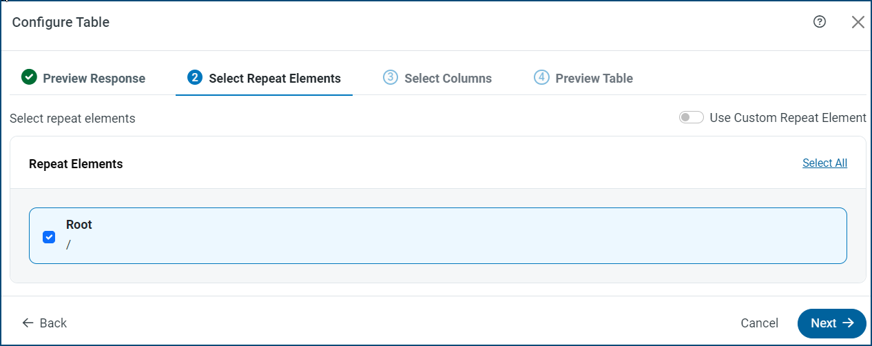 Select at least one repeat element for your table. A repeat element is the path of the element in the API response that contains repeating items that are to be used as rows. Sync returns each detected array in the response data, which allows you to choose multiple paths. In this example, source is the repeat element.