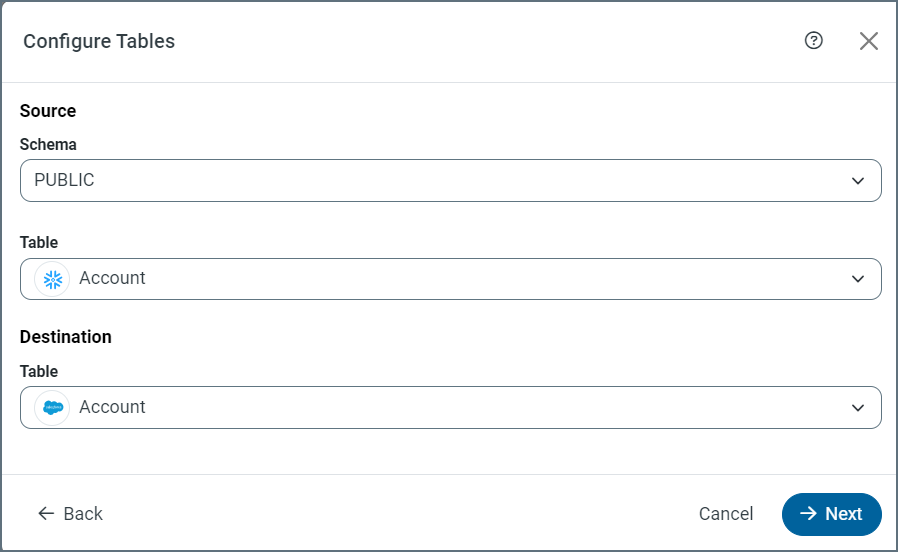 Select your schema, a source table, and a destination table in the Configure Tables dialog box.