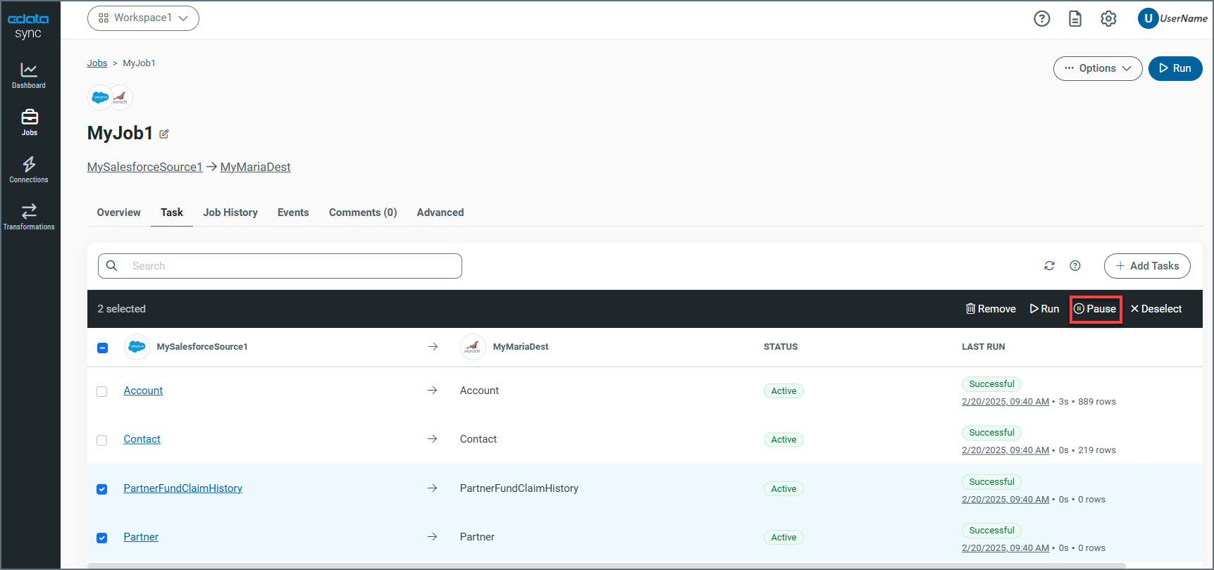 CData Sync enables you to pause and resume tasks. A task’s Active or Paused status only determines whether the task runs when the entire job is executed (either on a schedule or manually). However, you can still run a paused task directly at any time.