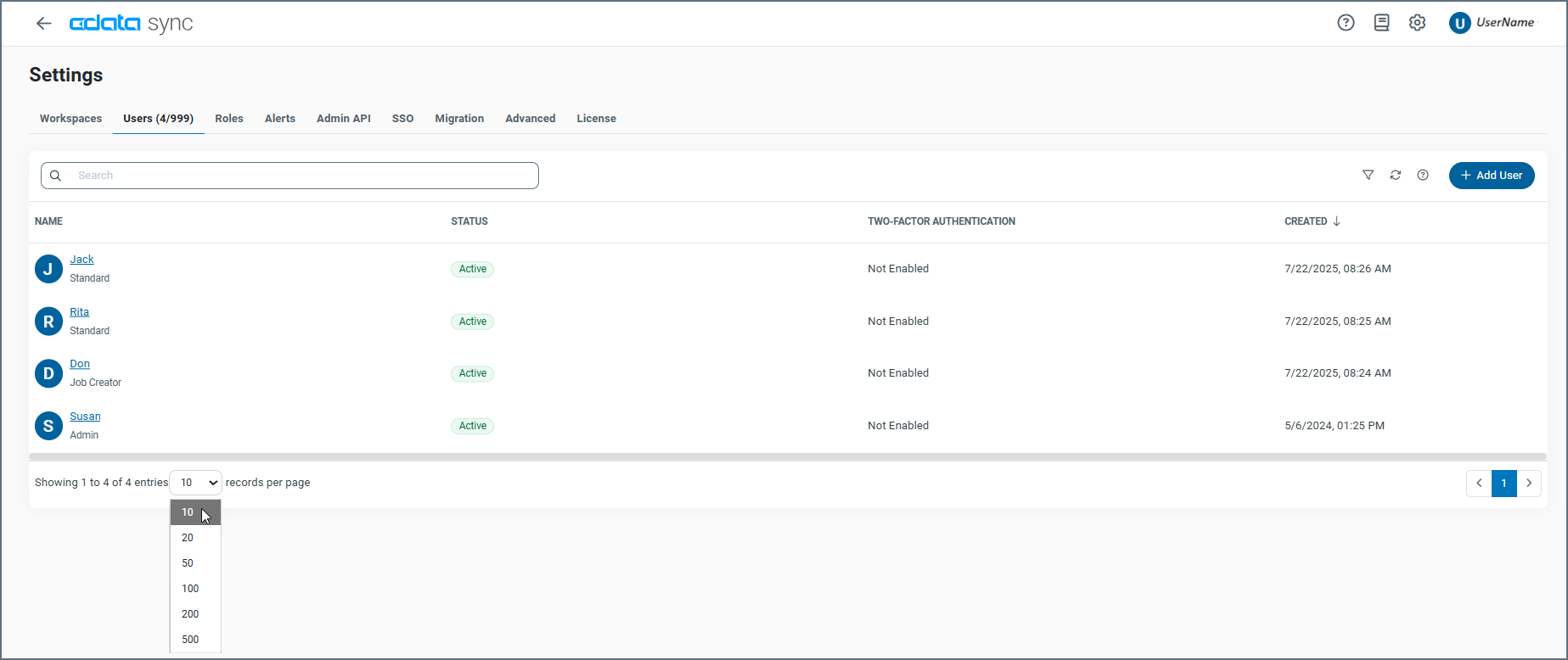 In addition, you can filter the table by role type and status. Sync also enables you to save filters that you define so that you can use them later. Unlike other pages, the Users page does not allow you to reset or save filter options. The only way you can clear a filter and return to the full Users table is to refresh the page from your browser bar.