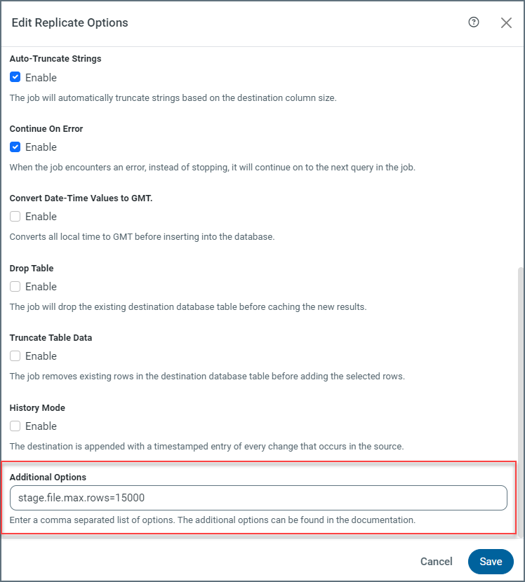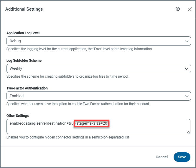 すべてのCDC ジョブは同じステージングエリアを共有するため、ステージングエリアのサイズを慎重に管理することが重要です。デフォルトでは、ディスクのオーバーロードを防ぐためにステージは10GB に制限されています。この制限はstagemaxsize プロパティを調整することで変更できます。これを行うには、設定 > 高度な設定 > 追加設定 > その他の設定に移動し、以下に示すようにプロパティを適切な値(例えば、stagemaxsize=20)に設定します。