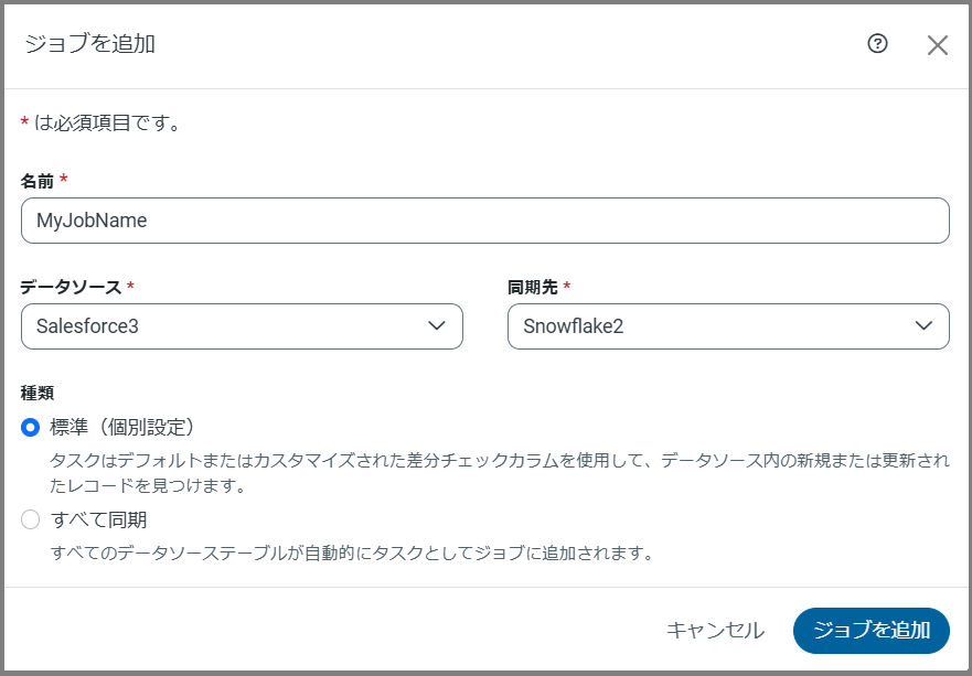 すべて同期:このジョブの種類を選択すると、Sync はすべてのデータソーステーブルをタスクとしてジョブに自動的に追加します。