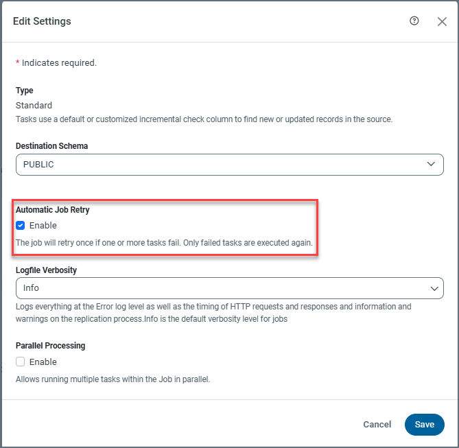 CData Sync は、タスクエラーやネットワークの問題などで、1つ以上のタスクが失敗した場合にジョブの再試行を試みるジョブの自動再試行機能を提供します。ジョブの自動再試行処理は、ジョブ内の失敗したタスクにのみ適用されます。例えば、1つのタスクが失敗した場合、プロセスはその1つのタスクのみを再試行します。