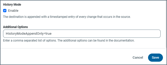 Scroll to the History Mode option.To enable the History Mode option, select Enable.有効にすると、Sync はデータソースで発生するすべての変更に対してタイムスタンプ付きのエントリを同期先に追加します。(If you want to disable the option, clear the Enable checkbox.)