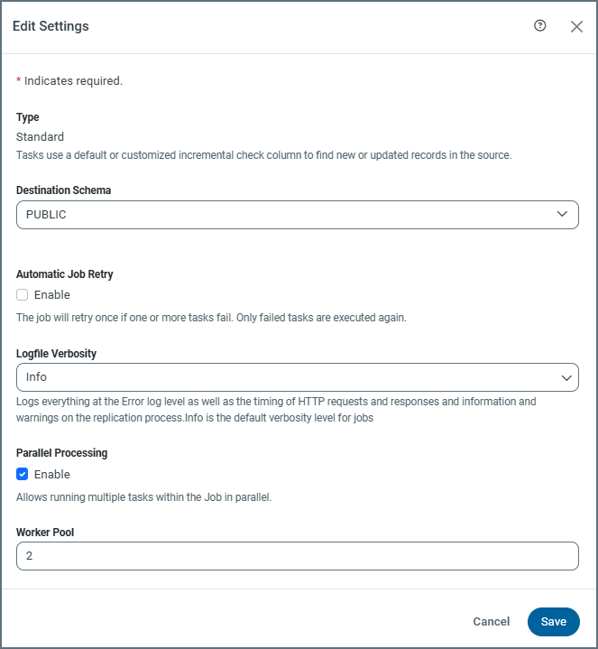 CData Sync ジョブが並列処理を使用するように設定できます。これは、アプリケーションが1つのジョブを処理するために複数のワーカースレッドを使用することを意味します。並列処理により、Sync はワークロードを複数のプロセスに分割し、複数のテーブルを同時に移動できるようにします。その結果、より少ない時間でより多くのデータが移動され、ジョブ効率が大幅に向上します。Sync では、ジョブ単位で必要な数のワーカーを割り当てることができます。