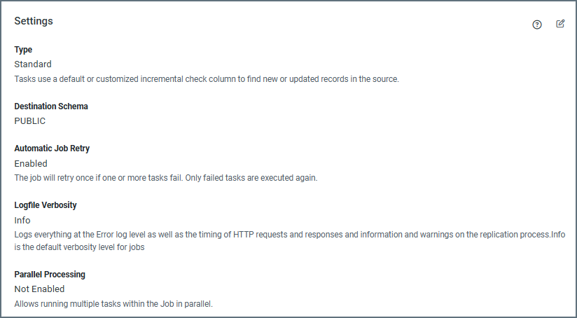 詳細レベル ログ情報 None このジョブに対してログを記録しないように指定します。 Error クエリ、クエリによって返された行の数、実行の開始時間と終了時間、およびエラーを記録します。 Info Error ログレベルのすべてに加えて、HTTP 要求と応答のタイミング、レプリケーションプロセスに関する情報と警告を記録します。Info はジョブのデフォルトの詳細レベルです。 Transfer Info ログレベルのすべてに加えて、ヘッダーおよびHTTP 要求・応答の変換データを記録します。 Verbose Transfer ログレベルのすべてに加えて、レプリケーションの詳細と、問題のトラブルシューティングに役立つ同期先との通信を記録します。 詳細レベルをTransfer やVerbose に設定すると、データソースアプリケーションと同期先データベース間で転送された生データを公開します。接続プロパティ(パスワードなど)はマスクされますが、このレベルのログを組織外で共有する場合は、事前に機密情報を確認する必要があります。