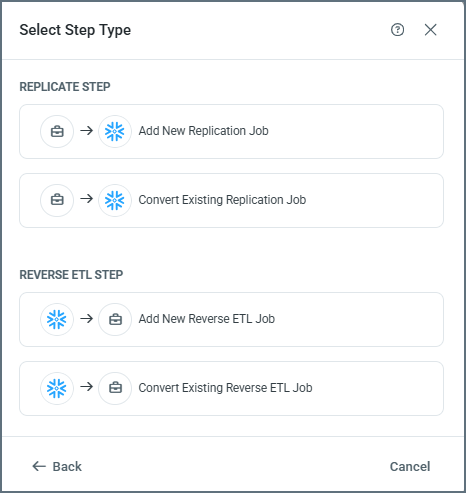 Reverse ETL step—Uses an existing reverse ETL job to move data from a destination back into a source system.