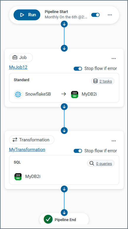 Pipelines enable you to coordinate multi-step workflows by combining replication jobs, reverse ETL jobs, transformations, and event-based scripts into a single, automated execution flow.