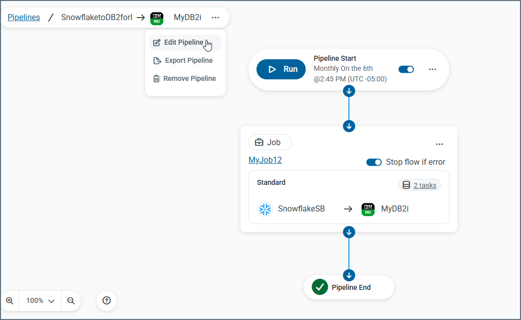 From the Pipeline editor (Pipelines > YourPipelineName), you can edit a pipeline, configure scheduling, edit associated jobs, and enable email notifications.