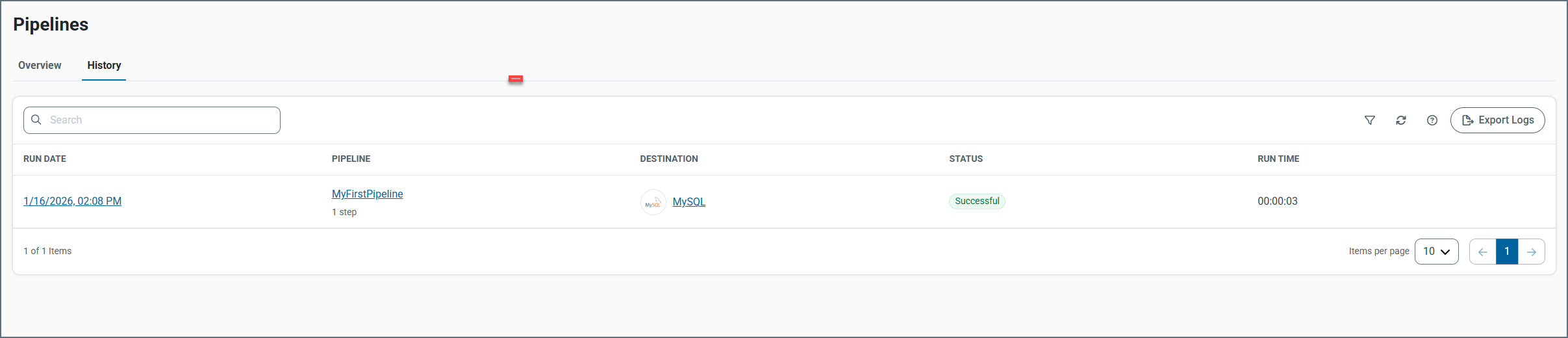 You can filter the history table by pipeline, destination, and status. Unlike other tabs, the History tab does not allow you to save filter options. After you set a filter, you can clear filter options in one of two ways: