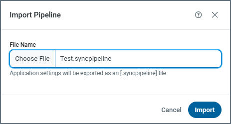 Click Choose File to open a file explorer. Select the pipeline file that you want to import, and then click Open. (The file should have a .syncpipeline extension.)