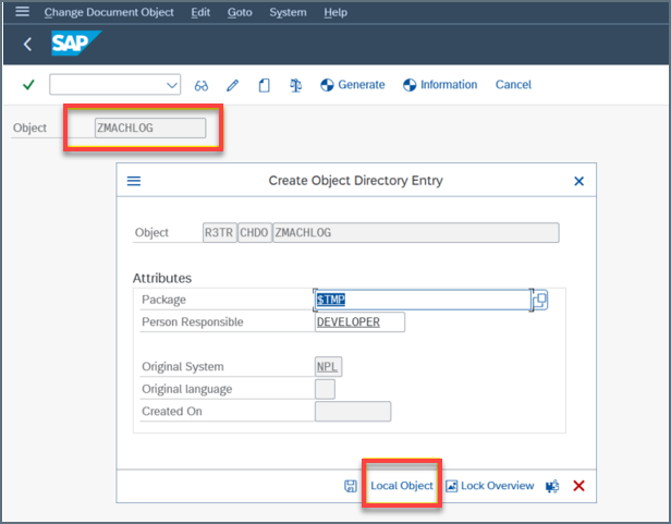 Select Local Object from the Package list. Provide a short description of the object (for example, “Change Document Object for Machines Tab”).
