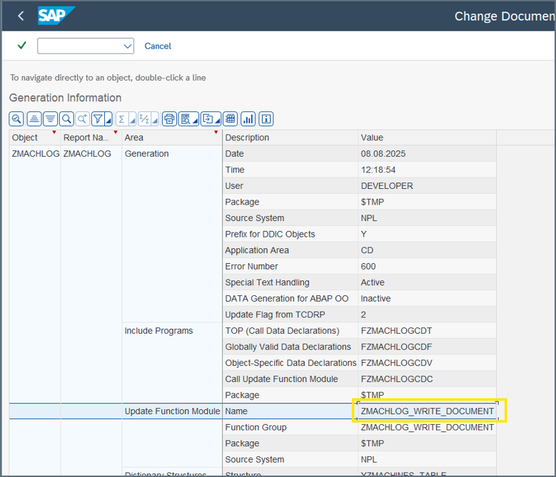 At this point, the infrastructure for change documents in SAP is in place. However, no entries are logged until the system-generated function module (ZMACHLOG_WRITE_DOCUMENT) is invoked. This invocation must occur within the application logic, update module, or custom program that modifies the table, ensuring that each change is explicitly captured and recorded.