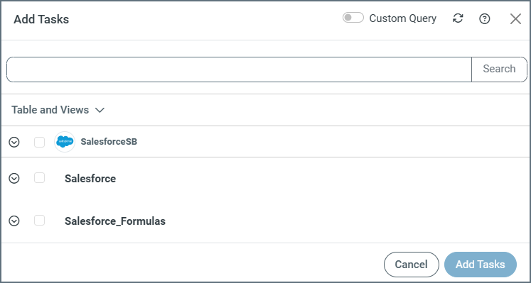 When you add or edit a task in a Salesforce job, Sync displays the two schema options, Salesforce and Salesforce_Formulas, in the Add Tasks dialog box.