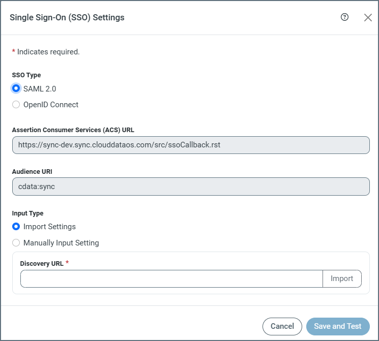 Sync のシングルサインオン(SSO)設定ダイアログボックスで、ディスカバリーURL を、Entra ID にあるApp Federation Metadata URL 値に設定します。次に、インポートをクリックして、残りの設定をSync にインポートします。