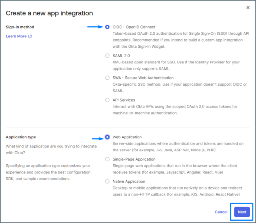 新しいアプリ統合の作成ダイアログボックスで、サインイン方式にOIDC - OpenID Connect を、アプリケーションの種類にWeb アプリケーションを選択します。続いて、次へをクリックします。