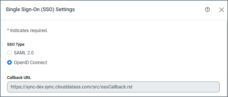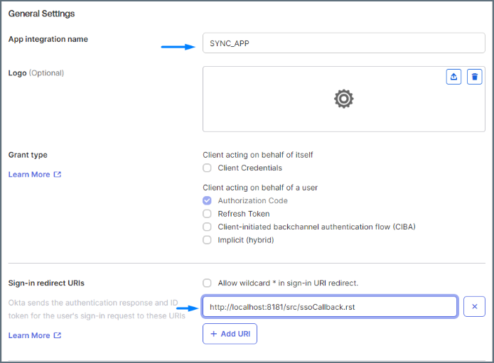 Okta で、リダイレクトURI を、以下に示すようにSync のシングルサインオン(SSO)設定ダイアログボックスで指定されているコールバックURL 値に設定します。