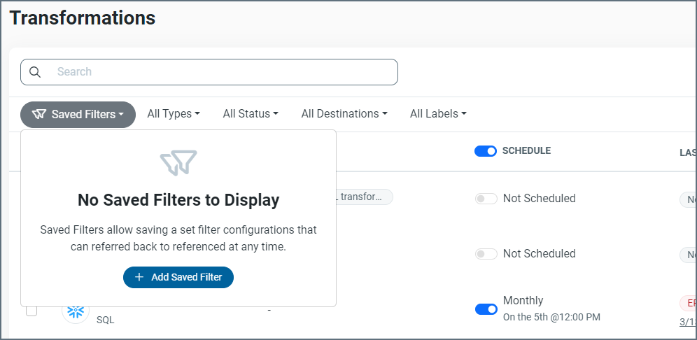 特定の変換ページ(変換 > YourTransformationName)から、実行スケジュールのトリガーの設定、クエリの追加および管理(SQL クエリのみ)、カラムのマッピングなど、特定の機能を設定できます。