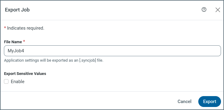 By default, the job name is included in the File Name text box and the Enable option Export sensitive values is not selected. Application settings are exported as a SYNCJOB file (for example, MySettings.syncjob).