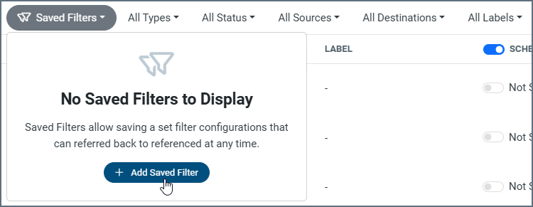 In addition, you can filter the table by job type, status, source connection, destination connection, and label. After you set filters, you can clear all filter options by clicking the Reset link to the right of the filter menu. Sync also enables you to save filters that you define so that you can use them later.
