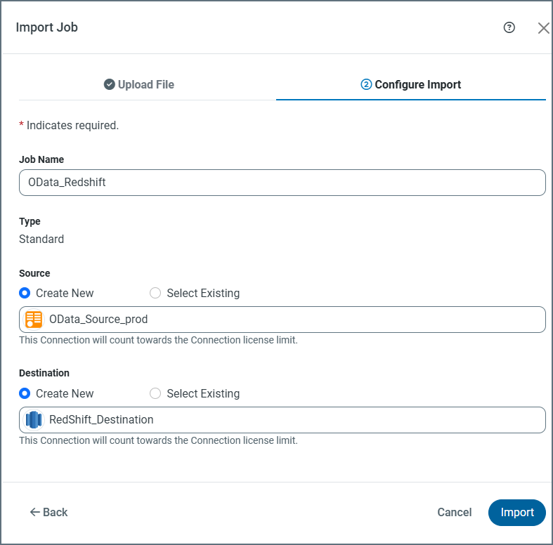 Keep the original job name or modify it, as necessary. Then, choose whether to create a new source and destination or to select an existing source and destination.