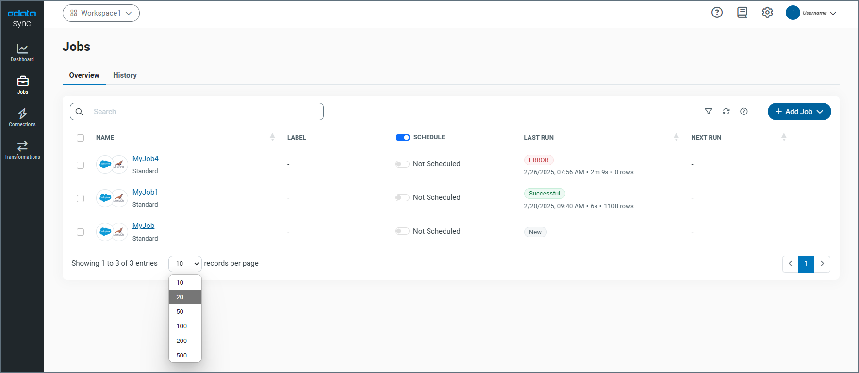 Adding a job requires preconfigured source and destination connections. After you define a source connection to your data source and a destination connection to your database, follow these steps to create a new job: