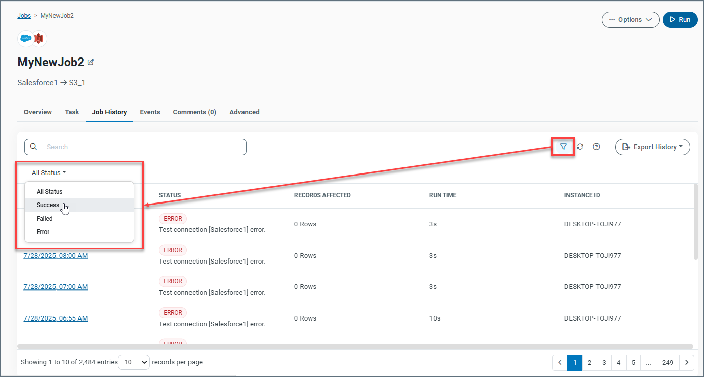 To see a table of log files with a specific run status (All Status, Success, Failed, or Error), click the Show Filter icon (shown in the small red square below) . This action displays the All Status menu at the top of the logs table (shown in the larger red square).