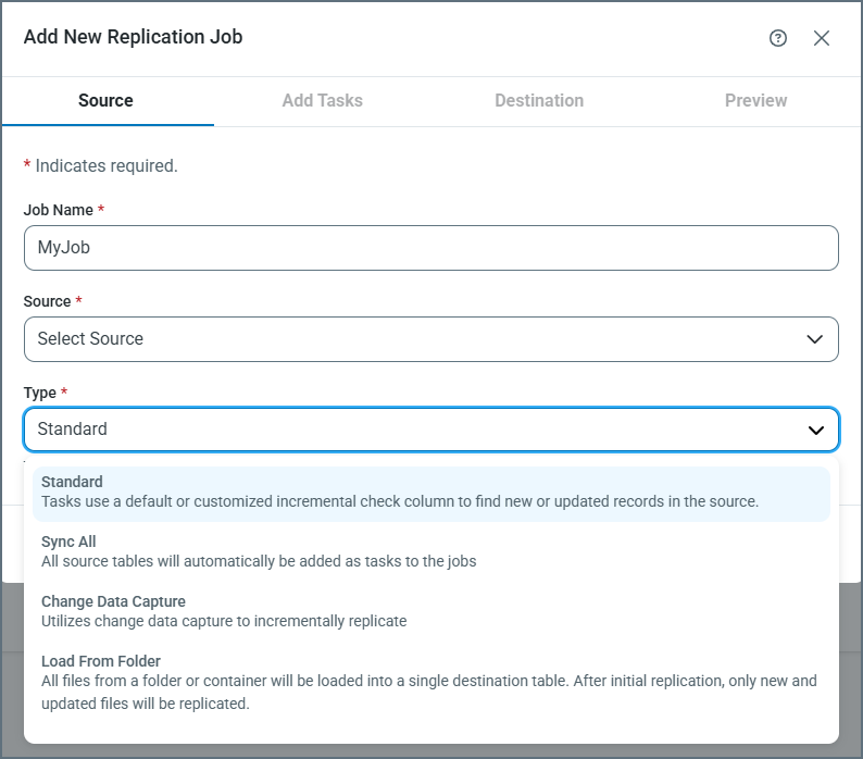 Source tab: Enter a job name, select a source connection, and select a replication type. Then, click Next.