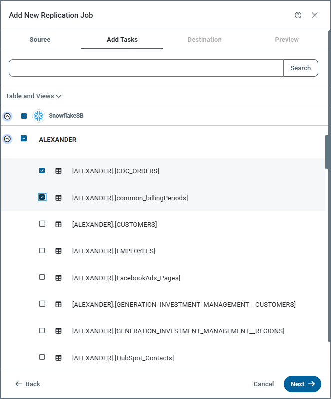 Add Tasks tab: Select one or more tables or views to replicate. Then, click Next.