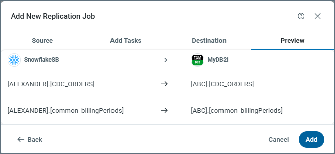 Preview tab: Review the configuration. When you are satisfied with the configuration, click Add to create the replication job.