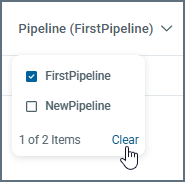 You can filter the history table by pipeline, destination, and status. Unlike other tabs, the History tab does not allow you to save filter options. After you set a filter, you can clear filter options in one of two ways: