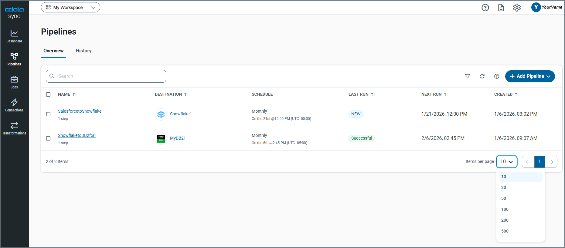 Each pipeline is shown in a separate row, with columns that provide information about each pipeline. You can control how many pipeline records are displayed on the page by selecting a value from the Items per page list at the bottom of the page, as shown below.