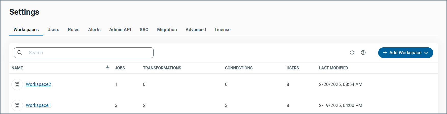The Workspaces tab summarizes your workspaces and enables you to manage them from one access point. The table on this page contains a row for each workspace that you have created (including the default workspace). Each workspace row details the number of jobs, transformations, and connections a workspace has as well as the number of users for the workspace and last-modified data. For more information, see Workspace Management.