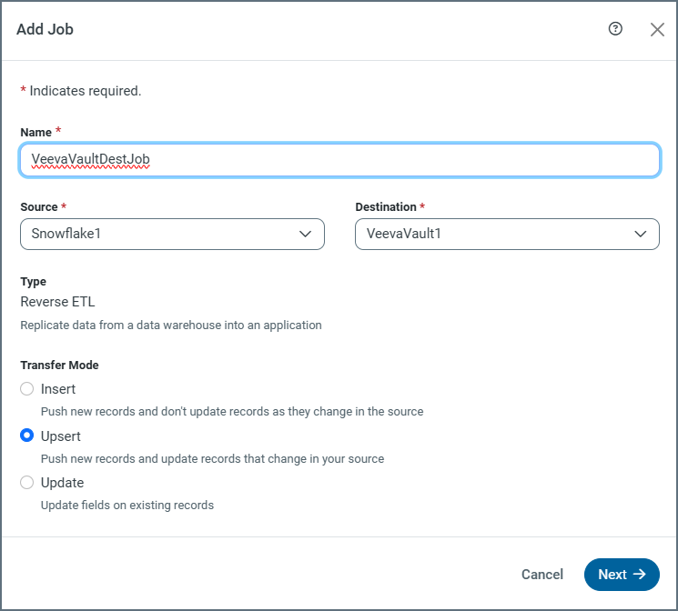 As a reverse ETL destination, Veeva Vault supports all three transfer modes (Insert, Upsert, and Update).