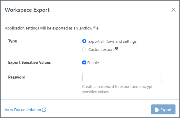機密値をエクスポート:機密値をエクスポートするには、ARCFLOW ファイルのワークスペースのエクスポートダイアログの機密値をエクスポートセクションで有効化をクリックします。