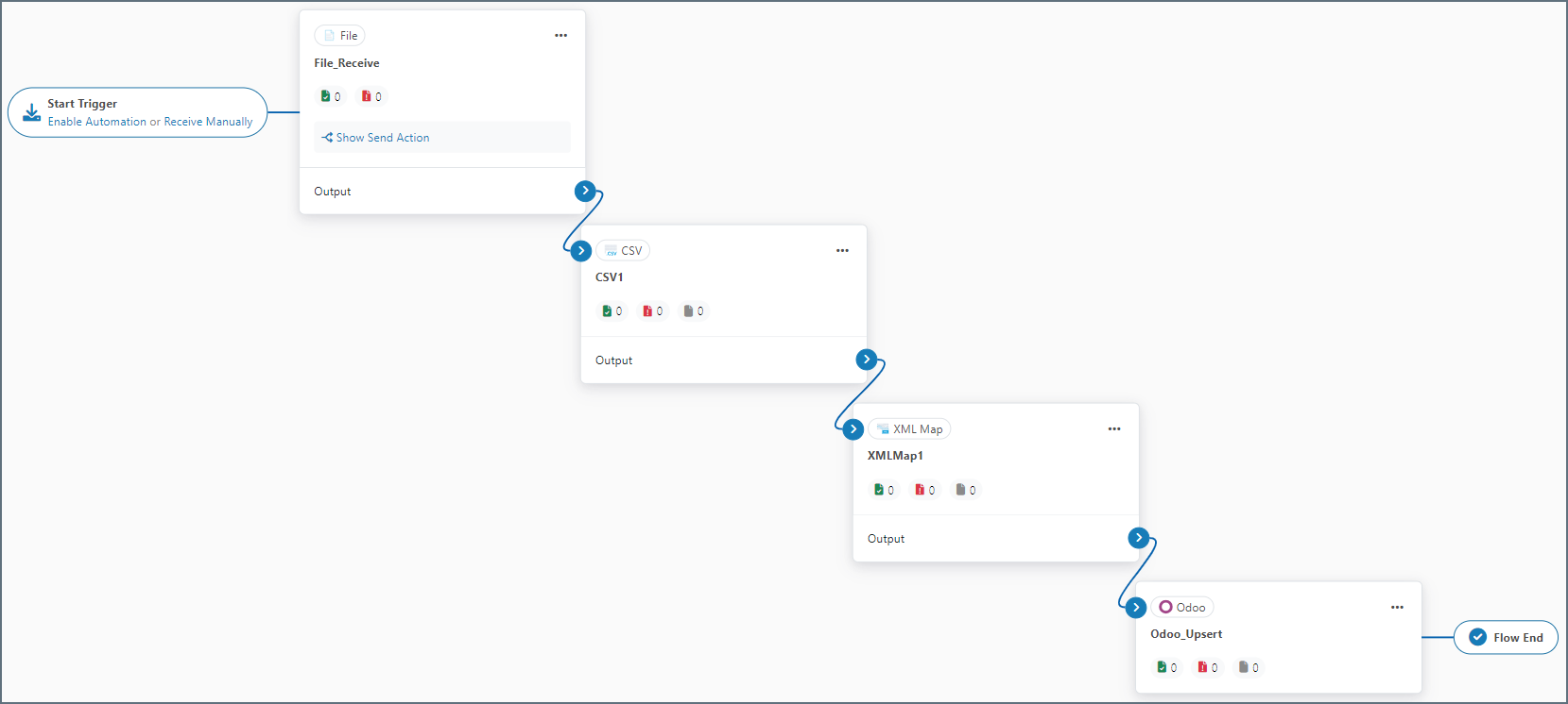 After you choose the tables and columns for the Upsert-configured Odoo connector, place the connector at the end of an Arc flow. The screenshot below depicts an example flow with a CSV connector, an XML Map connector, and a Odoo Upsert connector at the end: