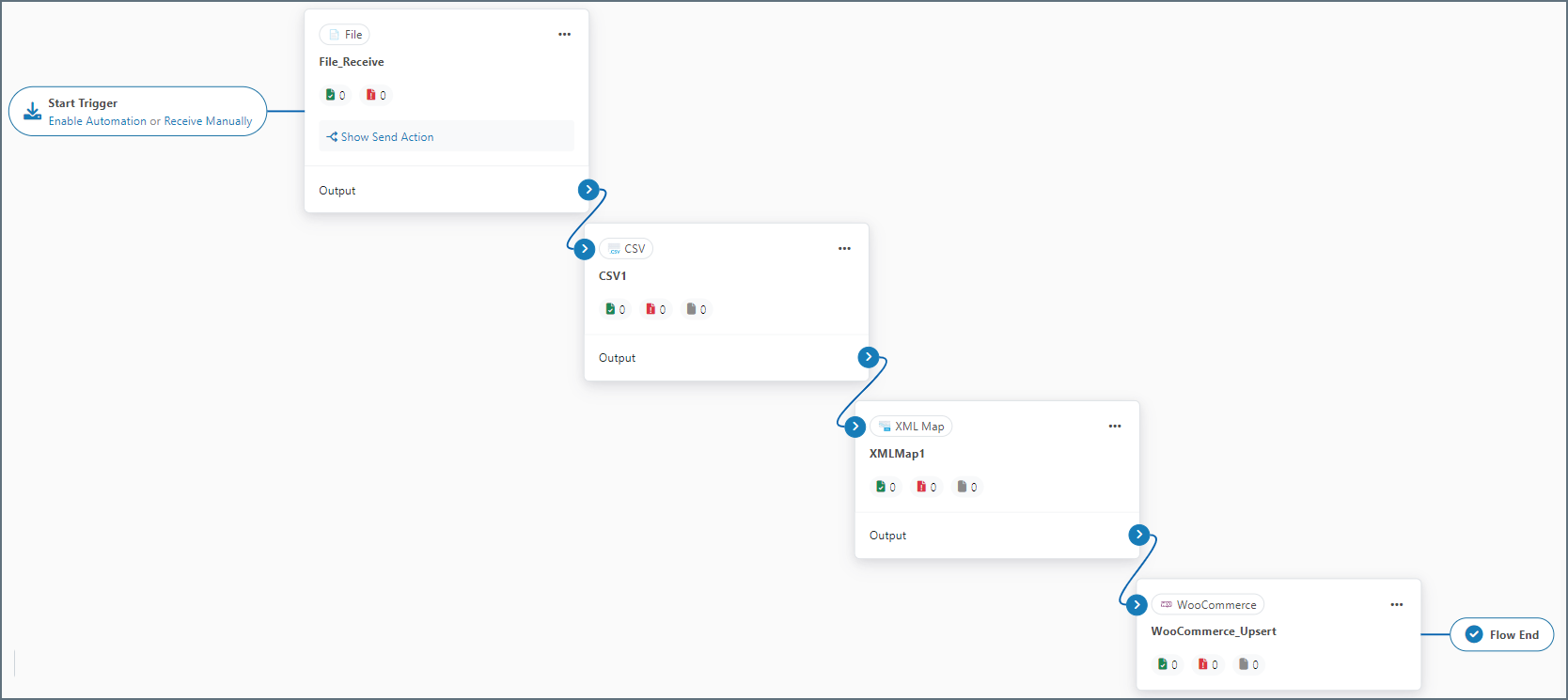After you choose the tables and columns for the Upsert-configured WooCommerce connector, place the connector at the end of an Arc flow. The screenshot below depicts an example flow with a CSV connector, an XML Map connector, and a WooCommerce Upsert connector at the end: