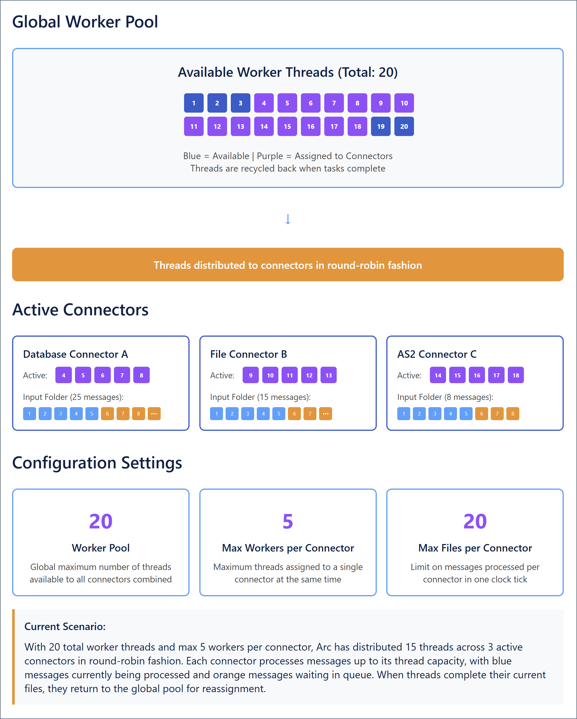 Increasing Max Workers per Connector for a particular connector tells the application to assign more system resources when processing that connector’s input files. This is useful when a particular connector acts as a bottleneck for flow throughput. However, because threads are assigned in round-robin fashion, increasing this setting for many different connectors might cause the application to run out of threads in the Worker Pool. When this happens, the application must wait for other threads to finish and be recycled before it can assign them to the remaining connectors.
