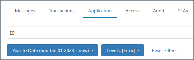 個々の検索でフィルタオプションと検索バーを併用して、返される結果を絞り込むことができます。次の画像は、ログレベルがError で、メッセージテキストに「EDI」という単語が含まれる、特定の時間帯のアプリケーションメッセージを表示しています。