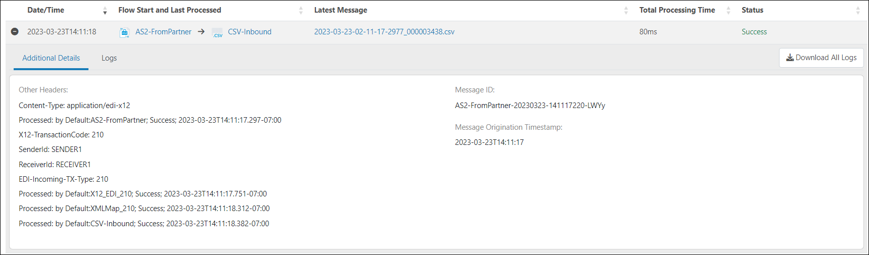 を使用します。メッセージに関連するすべてのログを含むzip ファイルをダウンロードするには、すべてのログをダウンロードボタンをクリックします。