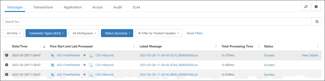 各アクティビティページタブの上部には、ページ内のすべてのログを検索するために使用できる検索バーがあります。また、ログの種類ごとに異なるオプションを備えた、コンテキスト依存のフィルタセクションもあります。例えば、メッセージタブには、日時、コネクタの種類、ワークスペース、ステータス、および追跡されたヘッダーのフィルタがあります。