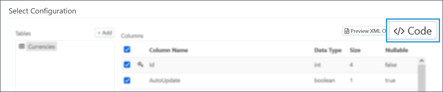 The XML Model for a table can be viewed by clicking </> Code above the configuration pane. The following XML is a simplified example model for a table called Account, which is modeled as the XML element <Account>: