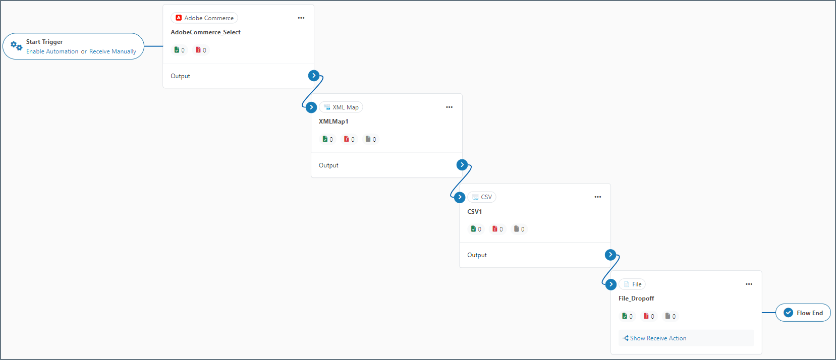 After you choose the tables and columns for the Select-configured Adobe Commerce connector, place the connector at the beginning of an Arc flow. The screenshot below depicts an example flow with a Adobe Commerce Select connector, an XML Map connector, a CSV connector, and a File connector at the end:
