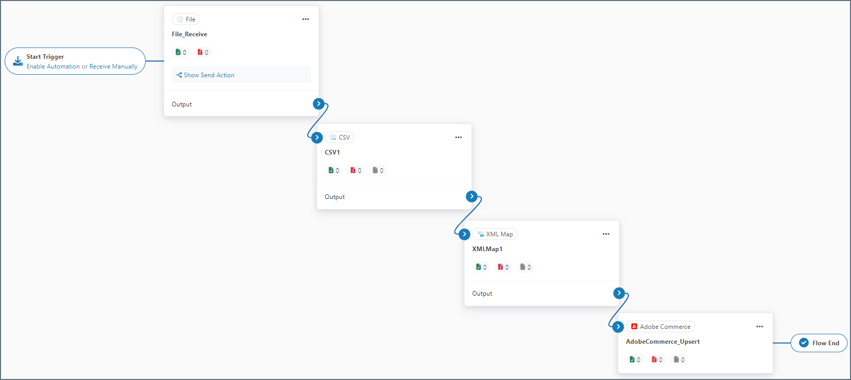 After you choose the tables and columns for the Upsert-configured Adobe Commerce connector, place the connector at the end of an Arc flow. The screenshot below depicts an example flow with a CSV connector, an XML Map connector, and a Adobe Commerce Upsert connector at the end: