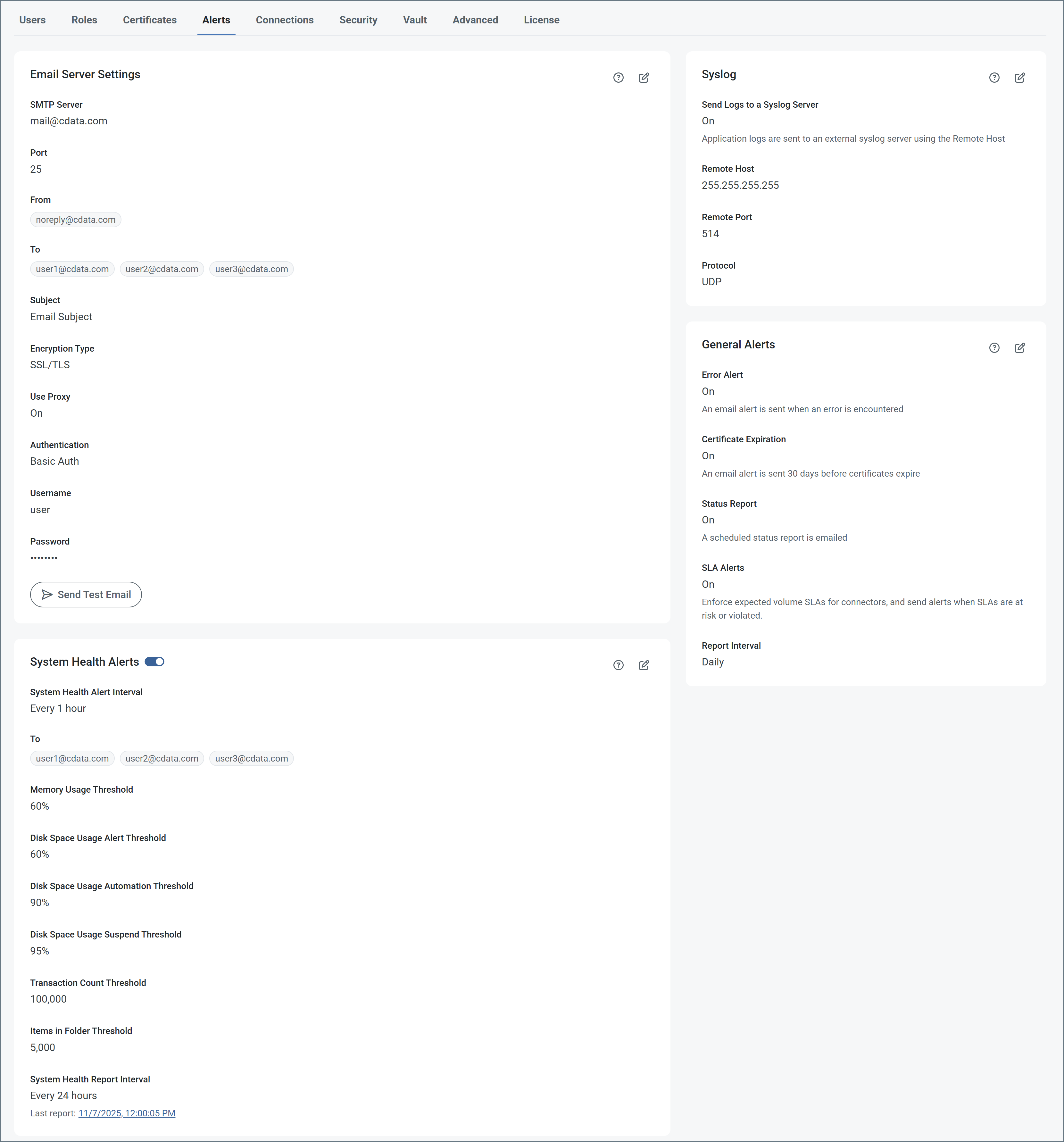アラートタブを使用して、インテリジェントな監視を設定できます。システムヘルス、証明書の有効期限切れ、処理エラー、重大なイベントなどについて、業務に影響が出る前にタイムリーなアラートで通知します。